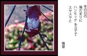 小枝で作ったハンモッグでスヤスヤと眠る子猫の姿に見えたので、